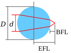 Effective focal length, EFL = nD/4(n−1) Back focal length, BFL = EFL − D/2 Numerical aperture, NA = 2 (n−1)/n