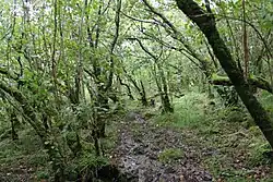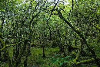 The canopy of the wood is primarily thick hazel stands, although some beech trees can be found in the eastern section.[1] Although hazels are more commonly understory trees in less extreme climates, they dominate this woodland due to their hardiness against wet and windy conditions, as well as their tolerance to thin, rocky soil.[4]