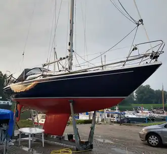 The Ballad 30 is a recreational keelboat, built predominantly of fibreglass, with wood trim. The hull is made from single skin polyester fibreglass, while the deck is a fibreglass-Divinicell sandwich. It has a masthead sloop rig with aluminum spars, a keel-stepped mast, wire standing rigging and a single set of unswept spreaders. The hull has a raked stem; a raised counter, reverse transom; a skeg-mounted rudder controlled by a tiller with an extension and a fixed fin keel. It displaces 7,276 lb (3,300 kg) and carries 3,417 lb (1,550 kg) of lead ballast.[1][2]