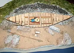 The remains of an 11 metre long Viking boat that dates back to between 850AD and 950AD was excavated by Gerhard Bersu in 1945.[20] The boat was a clinker-built oak vessel and was typical of the trading vessels that travelled the trading routes in the Irish Sea during this period.[5] Although the boat timbers have long rotted away, the iron nails that held it together mark its exact location and a stone cairn that is still visible today outlines the boat.[21] A large mound would have covered the site, but much of this was removed during Bersu's excavations as it was thought to make up part of the earlier Iron Age fortifications.[2]