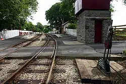 Ballasalla railway station, on the Isle of Man Railway, is on the eastern side of the village, and the railway operates seasonally between March and November. The station used to have its own cattle dock and goods sidings, seeing intensive use in the early to middle 20th century, but these were lost to office developments in 1985 when the station building was relocated. The Isle of Man Airport is at Ronaldsway just south of the village and also has a small request stop on the railway, a short distance from the terminal. Arriving air passengers sometimes catch trains for the novelty value of travelling by steam train.