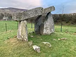 Ballykeel Dolmen is a Neolithic tripod portal tomb and a State Care Historic Monument at the foot of the western flank of Slieve Gullion in Northern Ireland. It is located above a tributary of the Forkhill river, in the Newry, Mourne and Down District Council area, at grid ref: H9950 2132.[1]