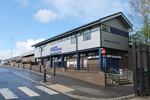 Ballymena railway station serves the town of Ballymena in County Antrim, Northern Ireland. It is located just outside Ballymena town centre on the Galgorm Road, and is integrated with the local bus station. It is situated on the Derry line between Antrim and Cullybackey. The station is operated by Northern Ireland Railways.