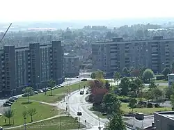 The Ballymun Flats referred to a number of flats—including the seven Ballymun tower blocks—in Ballymun, Dublin, Ireland. Built rapidly[3] in the 1960s, there were 36 blocks in total, consisting of 7 fifteen-storey, 19 eight-storey, and 10 four-storey blocks. The complex was built in a Corbusian style known as towers in the park, which was popular in European and American cities in the mid-20th century.[4]