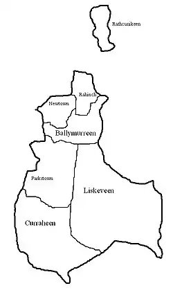 At the time of both the 1911 census,[5] the division was smaller than the civil parish of the same name, containing just three townlands (Curraheen, Parkstown and Liskeveen) of the seven that belong to the civil parish; the four other townlands from Ballymurreen civil parish belonged to Littleton electoral division.