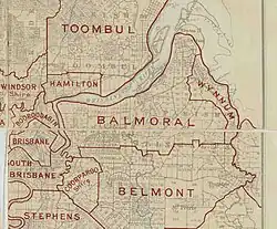 The Bulimba Division was one of the original divisions created on 11 November 1879 under the Divisional Boards Act 1879.[1] On 19 January 1888, the No. 1 subdivision of Bulimba Division was separated to create Balmoral Division.[2][3][4]