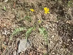 The leaves are compound pinnate, with the leaflet divisions also divided or deeply lobed. Basal leaves are hairy and may be up to 16 inches (41 cm) long.[2] There may be one to several stems, which are leafless and hairy, and topped by one flower each.[2][6]
