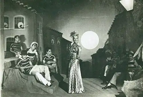 These include "A Jardineira" by Benedito Lacerda and Humberto Porto, sung by Orlando Silva, which proved to be the carnival smash of the 1939 celebrations, and "Sei que é covardia" by Ataúflo Alves and Claudionor Cruz. Banana da Terra is best remembered for Carmen Miranda's rendition of the Dorival Caymmi song "O que é que a baiana tem?", dresses in the "baiana" costume, in keeping with the song's lyrics.[6] It is said that the composer went to Miranda's house where he taught her performance. But it was Miranda who made the look her own and used it to launch her international career as the embodiment of a pan-Latin American identity. Banana da Terra was to be Miranda's last Brazilian film; it was when performing its hit song "O que é que a baiana tem?" at Rio's Urca casino that she was "discovered" by the show business impresario Lee Shubert and taken to Broadway, and subsequently to Hollywood.[7]