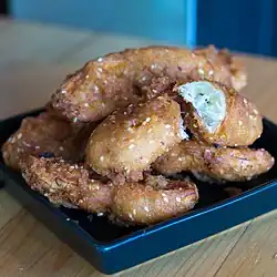 In Khmer, banana fritters are called num chek chien (នំចេកចៀន). They are made by dipping flattened bananas in a thick mixture of rice flour, sesame seeds, egg whites and coconut milk seasoned with salt and sugar and deep frying them in hot oil until crispy and golden. The Cambodian banana fritters are more savoury than sweet and are often eaten as a snack with coconut ice cream as a popular accompaniment.[4] A famous banana fritter shop in Cambodia is Chek Chean Pises operating since 2000 that has two locations in Phnom Penh – at Mao Tse Tong Boulevard and Kampuchea Krom Boulevard.[5]