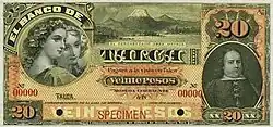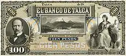 On October 27, 1885, it opened his first branch in Cauquenes, later opening branches in Parral (September 1, 1888) and Linares (January 27, 1890).[4][5] Like several banks of that time in Chile, Banco de Talca issued its own money, which was made through the printing of 5, 10, 20 and 100 peso notes; the first 5, 10 and 100 peso issues (made in 1885) included portraits of generals of the War of the Pacific, Benjamín Vicuña Mackenna and José Francisco Vergara, while the 20 pesos banknotes (made in 1888) carried the portrait of Tomás Marín de Poveda, founder of the city.[1]