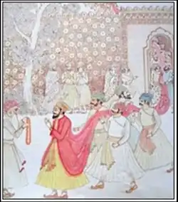 But Wazir Khan, who happened to be an admirer of Guru Hargobind, rather than arresting him, requested the Guru to accompany them to Delhi telling him that Emperor Jahangir wanted to meet him. The young Guru accepted the invitation and soon reached Delhi, where Jahangir interned him at the Gwalior Fort in 1609. Another version speaks of Guru Hargobind's imprisonment on the pretext that the fine imposed on Guru Arjan had not been paid by the Sikhs and Guru Hargobind.[19] It is not clear as to how much time he spent as a prisoner. The year of his release appears to have been either 1611 or 1612, when Guru Hargobind was about 16 years old.[19] Persian records, such as Dabistan i Mazahib suggest he was kept in jail between 1617 and 1619 in Gwalior, after which he and his camp were kept under Muslim army's surveillance by Jahangir.[20][21] As per some accounts, Guru Hargobind upon his release went to Amritsar, where people were celebrating the festival of Diwali. This important event in Sikh history is now termed the Bandi Chhor Divas festival.[22] It is thought that the guru had 52 strings for all Hindu kings to leave the prison with him.