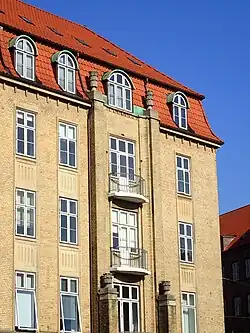 The first buildings on the north side of Sønder Allé came to inform the entire construction project; the windows are framed in ashlar and the parapets are formed with brick patterns. The buildings on Park Allé has a strong vertical expression with massive loggia-inspired porches pushed forwards from the main buildings which function as a counterweight to the length of the block. The ground floor is accentuated with horizontal brick patterns, almost a reversed shadow joint, to underline to solid character of the buildings. On Banegårdspladsen the vertical expression is different with brick columns around the main entrances which is also seen in the older Regina complex. The windows are framed in narrow lesenes and the cornices of sandstone are carried by corbels.[3]