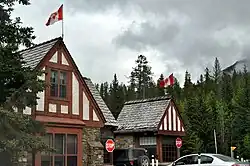 In 1902, the park was expanded to cover 11,400 km2 (4,400 sq mi), encompassing areas around Lake Louise, and the Bow, Red Deer, Kananaskis, and Spray rivers. Bowing to pressure from grazing and logging interests, the size of the park was reduced in 1911 to 4,663 km2 (1,800 sq mi), eliminating many eastern foothills areas from the park. Park boundaries changed several more times up until 1930, when the area of Banff was fixed at 6,697 km2 (2,586 sq mi), with the passage of the National Parks Act.[12] The act, which took effect May 30, 1930, also renamed the park Banff National Park, named for the Canadian Pacific Railway station, which in turn was named after the Banffshire region in Scotland.[16] With the construction of a new east gate in 1933, Alberta transferred 0.84 km2 (0.32 sq mi) to the park. This, along with other minor changes in the park boundaries in 1949, set the area of the park at 6,641 km2 (2,564 sq mi).[15]