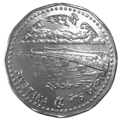 On October 1, 1993, 5 Taka coins were issued. The obverse of the design of this coin had the national symbol of Bangladesh. At the center of the National Emblem of Bangladesh is a lotus flower floating in water, surrounded by two grains of rice. At the top were three intertwined jute leaves and four stars, two each on either side of the leaf, and "Bangladesh Bank". The obverse of this coin had the Jamuna Bridge. Also on the reverse side the coin's year of issue, value of the coin in numerals and language are written.