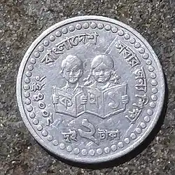 In 2004, 2 rupees coin made of "Steel" was issued. The obverse of the design of this coin had the national symbol of Bangladesh. At the center of the national emblem is a lotus flower floating in water, surrounded by two grains of rice. Three intertwined jute leaves at top and four stars in total, two each on either side of leaf. The obverse of this coin has two children (boy and girl) reading a book. The coin also had the year of issue, the inscription Bangladesh, the value of the coin in numerals and languages, and the slogan "Education for All".[4]