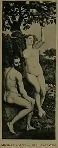 (Adam and Eve expelled from the Garden of Eden for eating the forbidden apple.)