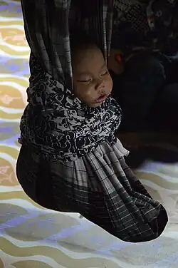 The Banjar have a cultural practice of putting infants to sleep in an upright sling made of tied fabric. The practice is called "bapukung."[11]