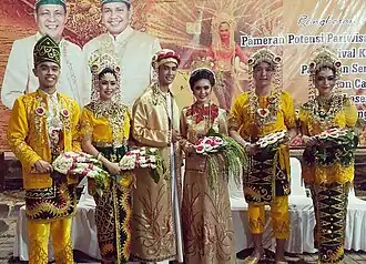 ![]() Three Banjarese couples wearing traditional Banjarese attire (from left to right: Bagajah Gamuling Baular Lulut, Babaju Kun Galuh Pasinan, and Baamar Galung Pancar Surya) in South Kalimantan, Indonesia | |
