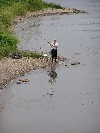 Bank fishing is fishing from banks or shores, typically very near but still above the water's edge. Bank fishing from rocky outcrops that protrude into the water is usually called rock fishing, and that from sand beach into the shoreside surf zone is called surf fishing. Bank fishing is typically done by angling, casting a tethered hook dressed with bait or lure into the water, and is usually performed by a rod often equipped with a reel, but handlines, nets, traps, bows, spears and snag hooks can also be used.