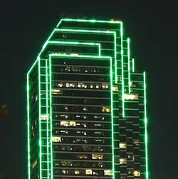 The building's facetted facade was first accented at night by nearly 2 miles (3 km) of green argon lighting running primarily at the edges and corners of the tower. The lighting design concept was by Theo Kondos Associates, lighting design firm in New York, NY. Due to the green lighting, the building is often referred to as "The Pickle." Green was chosen over red or blue because it is more visible from a distance. It has also been reported that the second tower, if built would have been accented with purple lighting (often called “The Eggplant”).