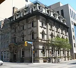 The first Toronto branch, designed by John George Howard was built in 1845, with exterior work by John Cochrane and Brothers,[6] at the northeast corner of Yonge Street and Wellington. The current building, designed by architect Henry Langley, replaced the original in 1875.[7] A restaurant occupies the ground floor with offices above.