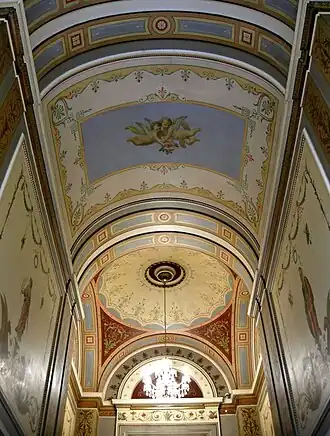 This is now the entrance hall and shop, and the walls are used to display temporary exhibitions. The saloon was also the grand hall, reception room, picture gallery and ballroom, with a little furniture at the sides, many oil paintings and gasoliers. It has rooflights with painted plaster decorations in the classical style around them. The marble fireplace features two large putti holding trumpets. Putti are also the central feature on the grand staircase ceiling – possibly a wistful element as Akroyd and his wife had no children.[2]