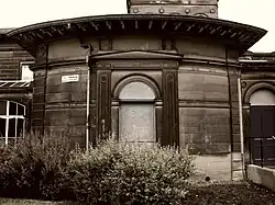 The wide eaves and fairfaced stone give the building an Italianate appearance. The pillared and enclosed entrance lobby was originally an open porte-cochere, or covered entrance-way for carriages, which would drive under the stone canopy for the passengers to disembark.[2]
