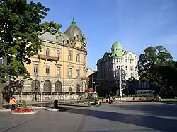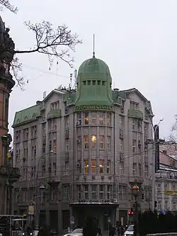 In 2000, the Lviv Institute of Banking, subordinate to the National Bank of Ukraine, was established on the basis of the Lviv Banking College.[93] At the beginning of 2001, in the Lviv region, there were 79 banking institutions, including four banks (legal entities), as well as 524 off-balance branches (the total amount of funds attracted by banks from individuals and legal entities amounted to 803.7 million hryvnias).[94] In 2005, architect Oleksandr Baziuk designed a modern office center for Ukrsotsbank, which changed the appearance of Mitskevicha Square (at that time the bank was owned by influential businessman Viktor Pinchuk, son-in-law of Ukrainian President Leonid Kuchma).[95]
