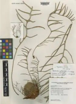 This banksia was first formally described in 1996 by Alex George in the journal Nuytsia from specimens he collected near Lake Grace, and given the name Dryandra fililoba.[4][5] In 2007, Austin Mast and Kevin Thiele transferred all the dryandras to the genus Banksia and this species became Banksia fililoba.[6][7] The specific epithet (fililoba) is from Latin words meaning "a thread" and "a lobe" referring to the fine lobes of the leaves.[4]
