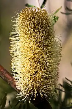 The complex flower spikes, known as inflorescences, appear generally from late summer to early winter (February to June) in New South Wales and Victoria, although flowering occurs in late autumn and winter in the Gibraltar Range.[6] Cylindrical in shape, they are composed of a central woody spike or axis, perpendicularly from which a large number of compact floral units arise. The flower spikes measure 5–10 cm (2–4 in) tall and 4–6 cm (1.6–2.4 in) wide.[8] Pale yellow in colour, they are composed of up to 1,000 individual flowers (784 recorded in the Gibraltar Range[6]) and arise from nodes on branchlets that are at least three years old. Sometimes two may grow from successive nodes in the same flowering season. They can have a grey or golden tinge in late bud. As with most banksias, anthesis is acropetal; the opening of the individual buds proceeds up the flower spike from the base to the top.[8] Over time the flower spikes fade to brown and then grey, and the old flowers generally persist on the cone.[10] The woody follicles grow in the six months after flowering, with up to 150 developing on a single flower spike. In many populations, only a few follicles develop. Small and elliptic, they measure 0.7–1.7 cm (0.3–0.7 in) long, 0.2–0.5 cm (0.1–0.2 in) high, and 0.2–0.4 cm (0.1–0.2 in) wide.[8] In coastal and floodplain populations, these usually open spontaneously and release seed, while they generally remain sealed until burnt by fire in plants from heathland and montane habitats.[11] Each follicle contains one or two fertile seeds, between which lies a woody dark brown separator of similar shape to the seeds. Measuring 0.9–1.5 cm (0.4–0.6 in) in length, the seed is egg- to wedge-shaped (obovate to cuneate) and composed of a dark brown 0.8–1.1 cm (0.3–0.4 in) wide membranous "wing" and wedge- or sickle-shaped (cuneate–falcate) seed proper, which measures 0.5–0.8 cm (0.2–0.3 in) long by 0.3–0.4 cm (0.1–0.2 in) wide. The seed surface can be smooth or covered in tiny ridges, and often glistens. The resulting seedling first grows two obovate cotyledon leaves, which may remain for several months as several more leaves appear.[8] The cotyledons of Banksia marginata, B. paludosa and B. integrifolia are very similar in appearance.[12]
