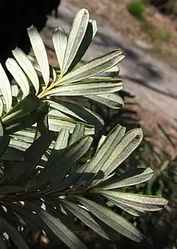 Banksia marginata is commonly called the silver banksia, because the white undersides of its leaves contrast with the otherwise green foliage and give the plant a 'silvery' look.[10] Alternate common names include honeysuckle and dwarf honeysuckle.[13] The aboriginal name in the Jardwadjali language of western Victoria was warock,[14] while the Kaurna name from the Adelaide Plains was pitpauwe[15] and the local name in the Macquarie Harbour region in Tasmania was tangan.[16]