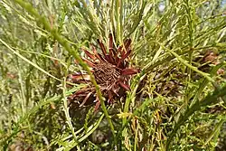 Banksia tenuis is a shrub that typically grows to a height of 1.5 m (4 ft 11 in) or is a mat-like shrub spreading to 3 m (9.8 ft) wide, but it does not form a lignotuber. The leaves are linear in outline, 60–260 mm (2.4–10.2 in) long and 2–5 mm (0.079–0.197 in) wide on a petiole up to 50 mm (2.0 in) long. The leaves are curved or bent, sometimes pinnatifid or serrated with up to twenty teeth on each side, or with smooth edges. The flowers are golden brown and cream-coloured and arranged in heads of between forty-five and sixty-five with reddish brown, egg-shaped to oblong involucral bracts 40–45 mm (1.6–1.8 in) long at the base of the head. The perianth is 27–33 mm (1.1–1.3 in) long and the pistil 23–31 mm (0.91–1.22 in) long. Flowering occurs from March to July and the fruit is a glabrous, egg-shaped follicle 14–17 mm (0.55–0.67 in) long.[3][4]