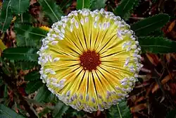 The flowers are arranged in flower spikes or capitate flower heads.[4] The character most commonly associated with Banksia is the flower spike, an elongated inflorescence consisting of a woody axis covered in tightly packed pairs of flowers attached at right angles. A single flower spike generally contains hundreds or even thousands of flowers; the most recorded is around 6000 on inflorescences of B. grandis. Not all Banksia have an elongate flower spike, however: the members of the small Isostylis complex have long been recognised as banksias in which the flower spike has been reduced to a head; and recently the large genus Dryandra has been found to have arisen from within the ranks of Banksia, and sunk into it as B. ser. Dryandra. They similarly have capitate flower heads rather than spikes.