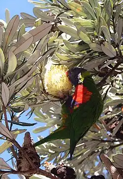 Banksias are heavy producers of nectar, making them an important source of food for nectivorous animals, including honeyeaters and small mammals such as rodents, antechinus, honey possums, pygmy possums, gliders and bats.[24] Many of these animals play a role in pollination of Banksia. Various studies have shown mammals and birds to be important pollinators.[25][26] In 1978, Carpenter[27] observed that some banksias had a stronger odour at night, possibly to attract nocturnal mammal pollinators. Other associated fauna include the larvae of moths (such as the Dryandra Moth) and weevils, which burrow into the "cones" to eat the seeds and pupate in the follicles; and birds such as cockatoos, who break off the "cones" to eat both the seeds and the insect larvae.