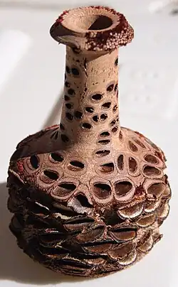Banksia wood is reddish in color with an attractive grain but it is rarely used as it warps badly on drying. It is occasionally used for ornamental purposes in wood turning and cabinet paneling. It has also been used to make keels for small boats. Historically, the wood of certain species such as B. serrata was used for yokes and boat parts.[38] The large "cones" or seed pods of B. grandis are used for woodturning projects. They are also sliced up and sold as drink coasters; these are generally marketed as souvenirs for international tourists. Woodturners throughout the world value Banksia pods for making ornamental objects.