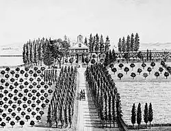 After Phineas Banning died, Hancock Banning maintained the residence until his death in 1894,[9] and the house continued to be occupied by the Banning family until 1925.[6] In 1927, the house and grounds were purchased by the City of Los Angeles to create a city park for the residents of Wilmington.[6][9] In 1934, the Los Angeles Board of Park Commissioners proposed restoring the house, and the Banning family donated many of the original furnishings and equipment.[10][11] Motion picture studios, including Twentieth-Century Fox, Warner Brothers and Paramount, contributed wallpapers to conform to the Civil War era.[12] Following the restoration, the formal dedication took place in 1936 and was attended by Governor Frank Merriam, Senator William Gibbs McAdoo, and Mayor Frank L. Shaw.[12] It opened to the public in 1938,[9][13] closed in 1941 at the start of World War II, and did not reopen until 1952.[14][15][16]