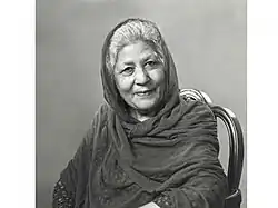 Bano Qudsia (Urdu: بانو قدسیہ; 28 November 1928 – 4 February 2017), also known as Bano Aapa,[4] was a Pakistani novelist, playwright and spiritualist. She wrote literature in Urdu, producing novels, dramas plays and short stories. Qudsia is best recognized for her novel Raja Gidh.[5] Qudsia also wrote for television and stage in both Urdu and Punjabi languages. Her play Aadhi Baat has been called "a classic play."[6] Bano Qudsia died in Lahore on 4 February 2017.[7]