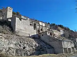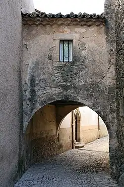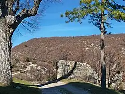 The term grange (barn) in this area refers to an isolated farm: this toponym is present in La Grange (at the northern border of the commune), also at La Grange (outside the village), and in Les Granges de Dauban.[17] The hill overlooking the village is called Le Défens: this is an area, owned by the lord or the community, where herds were banned.[17] Le Clos de Gardon is a cultivable area where the material from road ballasting was used to enclose the fields and meadows with a dry stone wall.[17] Les Chastellas was a fortification at high altitude[17] (which has been confirmed by excavations, see below) and La Tuilerie was a tile production workshop prior to the 18th century (before the term tuilière was used).[17]
