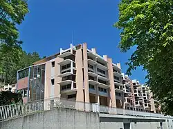 The village people started moving in the 19th century: people began to abandon the tight housing on the heights to build their houses near the crossroads of the roads to Sisteron, Apt, Manosque and Forcalquier in about 1840–1880. This new community was called La Bourgade.[26] The old village was not abandoned immediately as the church was enlarged and a hospital was built on the heights. In 1887, however, a college was built in the new village[30] on the Market Square (Place du Marché).[26] In 1905 a water jet fountain[26] sourced from the Brieux and fed by an underground aqueduct 3 km long[36] was built in the new village. Thereafter all new buildings, private or public, were built in the lower village (a church in 1911, a hospital in 1930) and, in 1950, the Orchards began to be converted to housing zones.[30]