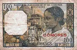 When the Comoro Islands became a separate French territory in 1946, the name of the issuing bank was changed to Banque de Madagascar et des Comores. A branch office opened in Comoros in 1953. While the banknotes were changed to reflect the new status of Comoros, the coins were not changed and bore only the name Madagascar.