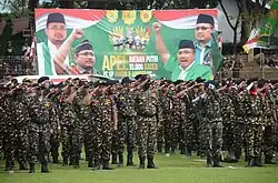 Multipurpose Ansor Front, better known as Banser (abbreviation of Barisan Ansor Serbaguna), is an Islamic militia organization based in Indonesia. It is a paramilitary wing of the youth organization Ansor Youth Movement (GP Ansor) affiliated with Nahdlatul Ulama (NU), the largest Islamic mass organization in the world. Banser operates as a semi-autonomous body of GP Ansor and mainly serves for the security and humanitarian operations. Combined personnel of Banser doubles the number for the Indonesian National Armed Forces (TNI), making Banser (and its parent organization GP Ansor) a political heavyweight which holds the key to the national stability.[4] Throughout the history, Banser had played major roles especially in issues related to religion, from the active participation in Indonesian mass killings of 1965–1966 against the perceived members of Indonesian Communist Party,[5] to the more recent development of standoff against Hizbut Tahrir Indonesia.[6] In terms of political orientation, Banser, along with GP Ansor, is characterized by traditionalist Islam, populism and nationalism.