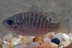 The bantam sunfish is dark in color with around ten vertical stripes visible along each flank. The lower jaw protrudes noticeably beyond the upper.[2]