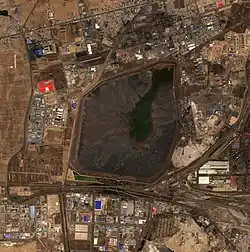 Baogang Tailings Dam, also known as the Baotou Tailings Dam or Weikuang Dam, is a tailings dam in Inner Mongolia, China, on the outer ring of the city of Baotou, about 20 kilometres from the city centre. The dam is filled with tailings and waste slurry from nearby rare earth mineral refinery plants. Accounts of the tailings dam appeared in western media outlets after a visit in 2015 by British writers Tim Maughan, Liam Young and Kate Davies from Unknown Fields, a "nomadic design studio" from London.[1][2] Footage posted on YouTube by Maughan appears to show him collecting samples from the floor of the dam. Maughan's account contrasts with the Chinese media's own reporting of the rare earth industry in the area.[3] In 2016, Chinese authorities identified contamination of farmlands surrounding the dam.[4] In recent years, the government has engaged in environmental cleanup efforts at the site.[5] However, raised earth embankments around the dam, along with a concrete wall, make it inaccessible to the public.