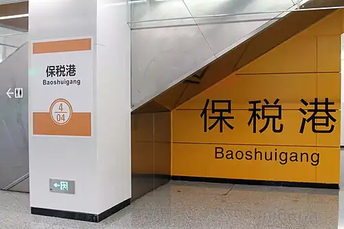 Baoshuigang station (Chinese: 保税港站; pinyin: Bǎoshuìgǎng zhàn; lit. 'Bonded Port station'), is an interchange station between Line 4 and Line 9 of Chongqing Rail Transit[3] in Chongqing municipality, China. It is located in Jiangbei District and opened in 2018.[1] A cross-platform interchange is provided between Line 4 and Line 9.