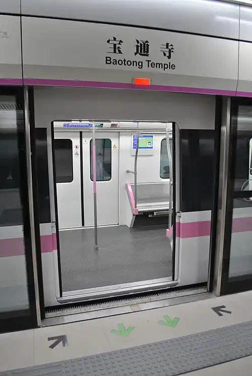 Baotong Temple Station (Chinese: 宝通寺站) is a station of Line 2 of Wuhan Metro. It entered revenue service on December 28, 2012. It is located in Hongshan District.[1] Baotong Temple is located to the immediate north of the station.