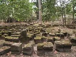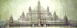 The Baphuon (Khmer: ប្រាសាទបាពួន) is a temple at Angkor, Cambodia. It is located in Angkor Thom, northwest of the Bayon. Also called "golden mountain" (svarnādrī), the Baphuon is built on an artificial hill. The temple was originally dedicated to Shiva and late converted to a Theravada Buddhist temple.[1] The dating of the temple has been fractious; recent work has shown that it was not built during the reign of Udayādityavarman II, as is popularly reported. In 2015 a French team directly dates four iron crampons integrated into the structure using the AMS Carbon-14 method, revealed the construction was much earlier than thought and can now be considered as the major temple associated with Suryavarman I (1010–1050CE), a ruler which had no temple previously associated with his reign.[2]