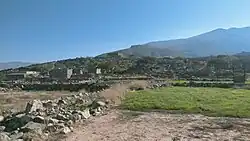To the southeast, the town stands on the cliff that forms the right side of the riverbed of the Wadi Baqal,[4][5] a tributary of the Wadi Nahela, which descends from the northwest slope of Jabal Harf (1,420 m),[3] very close to the village of Tala,[3] and which as it passes through Baqal forms a 90º bend to continue its course towards the south-southwest.