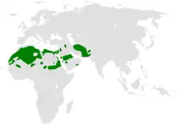 The bar-tailed lark has a large distribution across North Africa, the Arabian Peninsula, the Middle East and western Asia. Its range includes Afghanistan, Algeria, Bahrain, Cape Verde, Chad, Egypt, Iran, Iraq, Israel, Jordan, Kuwait, Libya, Mali, Mauritania, Morocco, Niger, Oman, Pakistan, Qatar, Saudi Arabia, Sudan, Syria, Tunisia, United Arab Emirates, Western Sahara and Yemen.[1] Its typical habitat is sandy or stony desert or semi desert, with low scrubby vegetation. It is generally shier than the desert lark and has a preference for level ground whereas the desert lark tends to frequent rocky slopes and hillsides.[4]