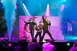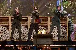 For their Melodifestivalen performance during their heat, the members of KAJ are surrounded by real spruce trees and sing the song in front of a woodshed, which is later converted to a sauna.[65] In addition, a real falukorv is grilled on stage,[1][66] and dancers wearing flannel shirts chop wood and later change into towels and dance with sauna whisks.[65] Lotta Furebäck was the creative director for the number, while Keisha von Arnold, Zain Odelstål, Jennie Widegren and Sacha Jean-Baptiste served as choreographers.[67] The sets reportedly cost a total of SEK 166,000 to build.[68] For the Melodifestivalen final, lasers and smoke machines were added to the performance.[69][64]