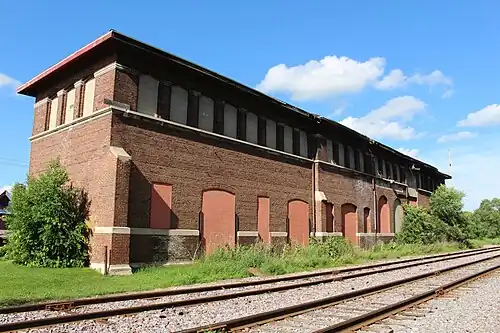Baraboo station is a former railway station in Baraboo, Wisconsin, built be the Chicago and North Western Railway (C&NW). The depot served both passengers and freight traffic as well as housing the Madison Division offices of the C&NW. The Madison Division covered a 219-mile (352 km) line from Belvidere, Illinois to Medary, Wisconsin. The depot was designed by the team of Frost and Granger, who designed more than 200 depots for the C&NW. This particular depot was built in the Romanesque Revival style.[1] Passenger service to the depot ended in 1963 with the elimination of the Rochester 400. As of 2022, the Sauk County Historical Society hopes to restore the depot into a museum and community gathering space.[2][3]